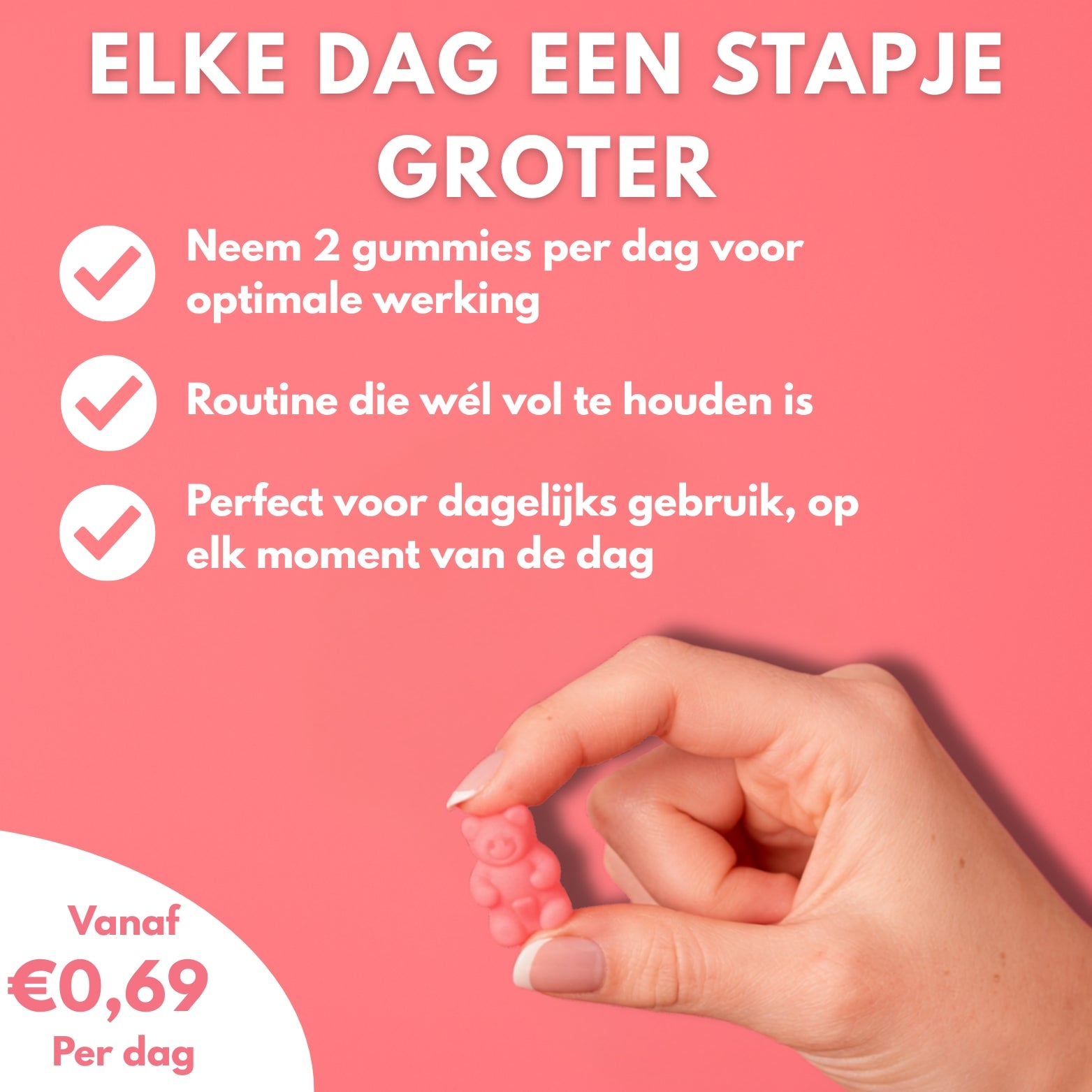 Het zou kunnen, maar het is echt niet nodig. De formule is zo samengesteld dat je lichaam het beste reageert op 2 gummies per dag. Een hogere dosering geeft geen sneller of beter resultaat en is daarom niet aanbevolen. Consistentie is veel belangrijker dan hoeveelheid. Dagelijks 2 gummies is precies wat je nodig hebt om de ingrediënten optimaal hun werk te laten doen.