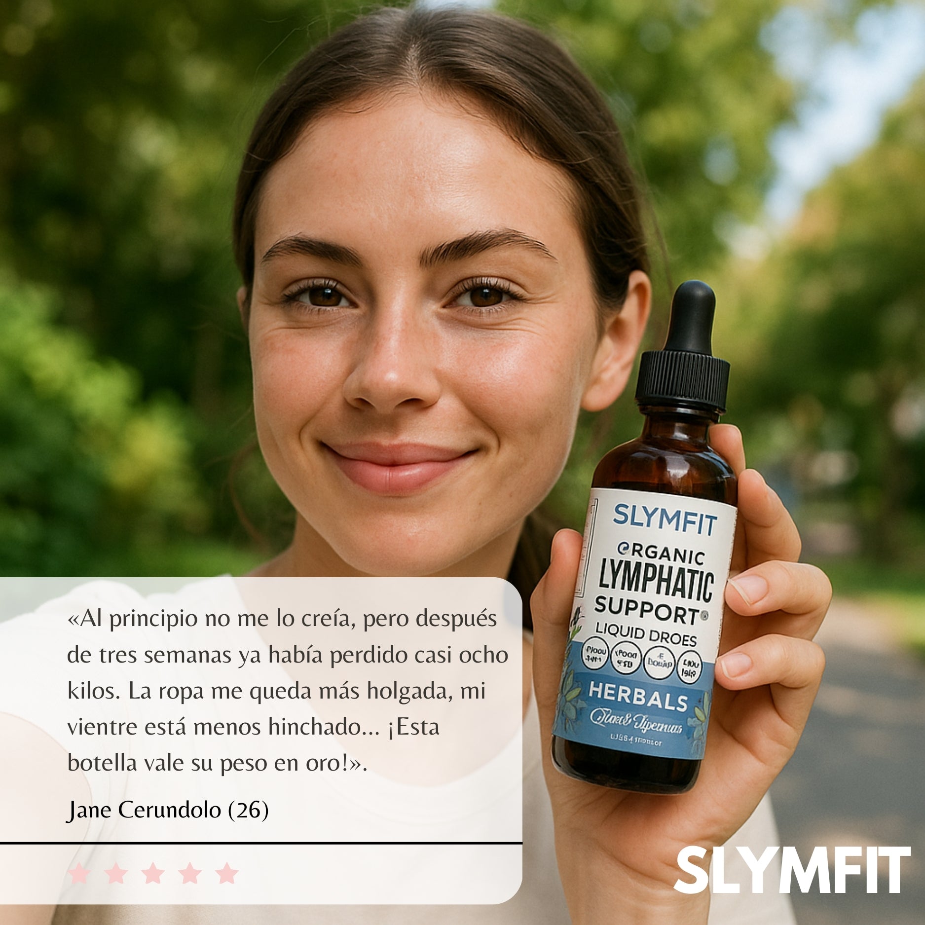 Me sentía muy hinchada, sobre todo en la zona abdominal y la cara. Desde que uso SLYMFIT, me siento mucho más ligera. La ropa me queda más holgada y tengo muchos menos antojos entre horas. Lo mejor es que no parece una dieta, sino un reinicio desde dentro.